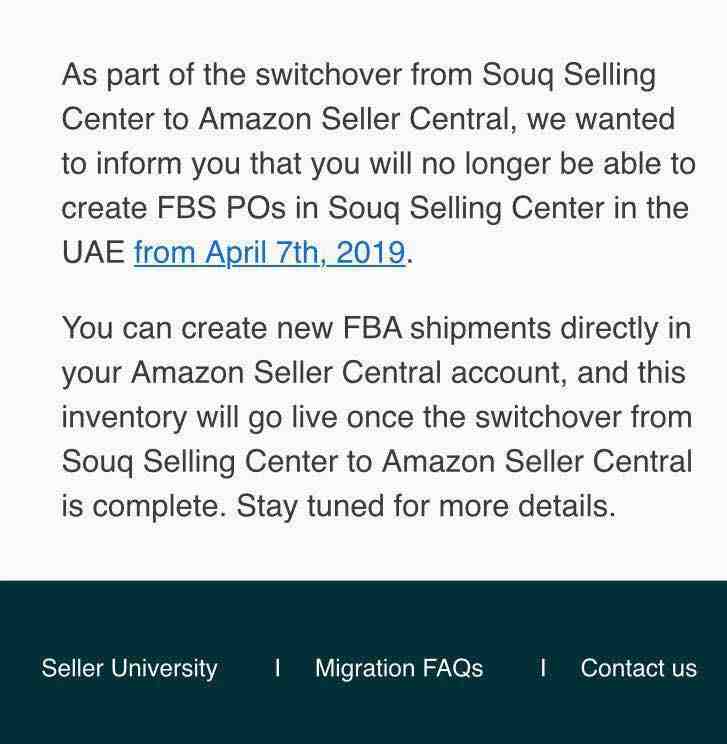 邮件告诉大家,4月7日起,卖家将不可在Souq后台上传FBS的PO,即使上传也将不会被审核,要求卖家使用新的后台amazon.ae上传产品。