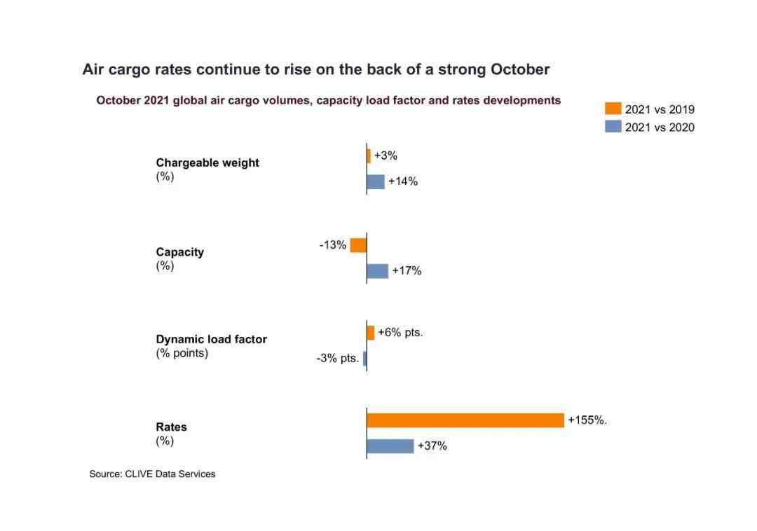 (与 2019 年 10 月和 2020 年 10 月相比,2021 年 10 月的航空货运费率分别上涨了 155% 和 37%。)