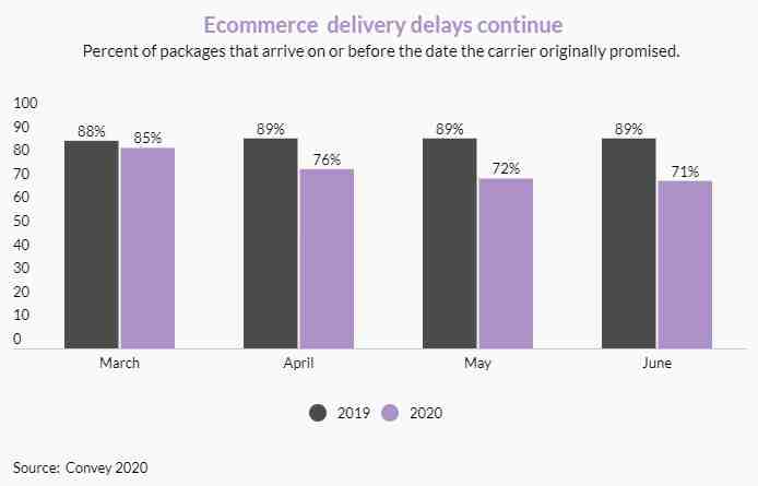 尽管订单量减少,但运输延迟继续困扰零售商。该公司发现,2020年6月,其网络中有71%的包裹被准时送达,而2019年6月的这一比例为89%。在过去几个月里,准时率一直在下降。2020年3月,85%的包裹按时送达,4月和5月分别下降到76%和72%。