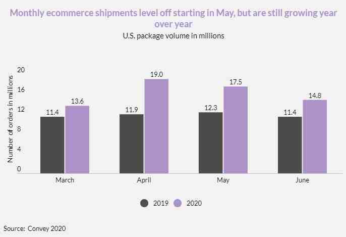 2020年4月,在美国大部分地区,由于冠状病毒的流行,门店整整一个月都关闭了。Convey网络的包装出货量达到了1900万份订单。与2019年4月相比,包裹数量增加了近60%。但自峰值以来,订单量逐月下降,5月份环比下降7.9%,6月份环比下降15.4%。