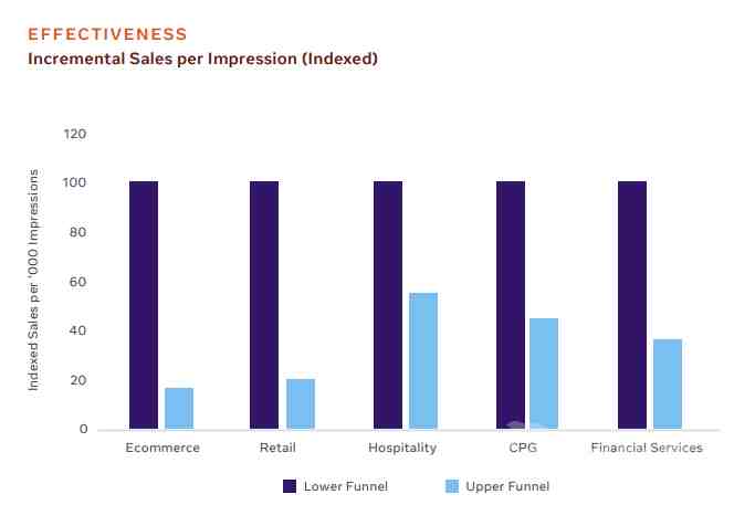 在调查报告中,Facebook 将两种营销策略分别归类为漏斗顶层和底层营销,报告总共分为三个图表。从第一个图表可见,直接响应营销(漏斗底层营销)能为品牌方带来更高的转化率,这也是广告主一直倾向于这一方案的主要原因。