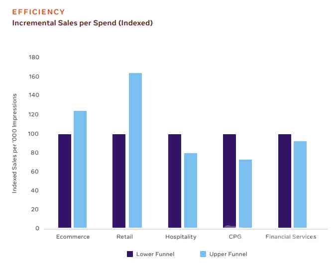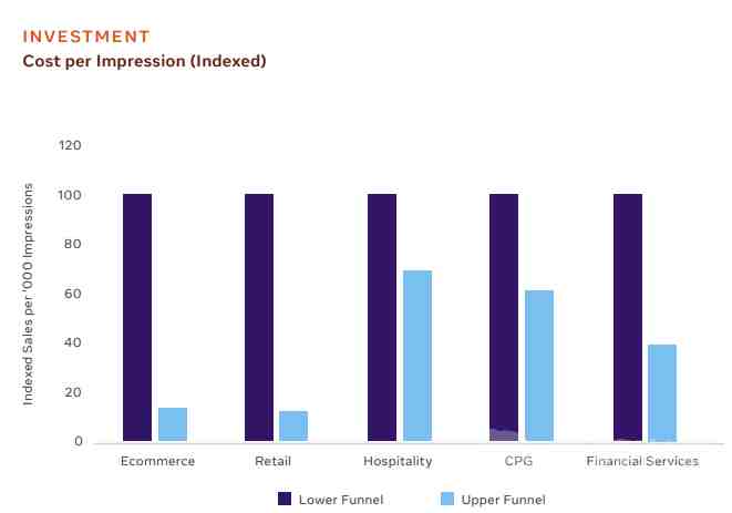 Facebook 表示:“如果以单次投放支出计算,那么漏斗顶层营销的 ROI 表现更佳。事实上,在电商和零售等特定行业中,顶层营销也一种更好的短期销售策略。”这意味着电商企业需要留意打造品牌,从而与更多用户建立联系,拉动营销收益。不过广告主也需要注意营销活动的成本和转化率。