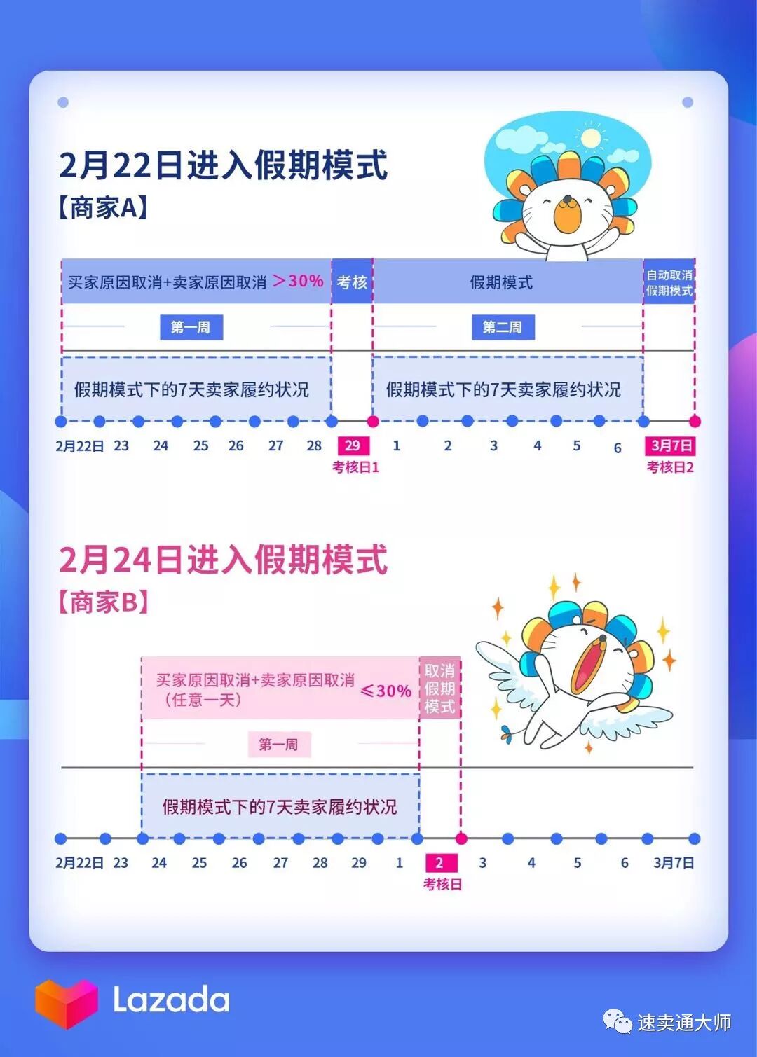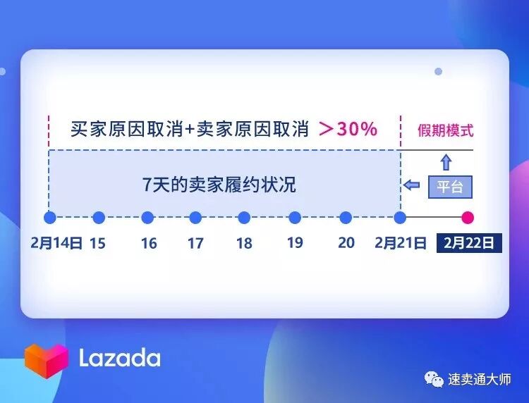 如果2月22日到2月28日之间,过去7天的因买家原因及入仓不及时的订单取消率没有一次降到30%或以下,则假期模式会被延长7天到3月6日,并在3月7日自动解除假期模式,恢复正常运营。