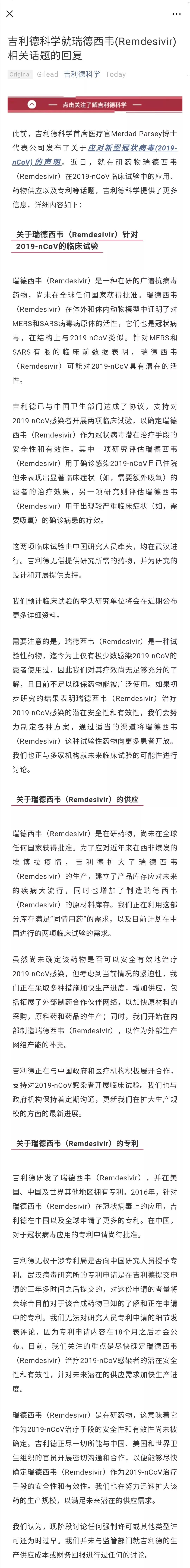 针对在研药物瑞德西韦(Remdesivir)对于新冠病毒的临床试验及专利申请等话题,瑞德西韦研发企业吉利德公司2月8日通过微信公众号“吉利德科学”(认证主体:吉利德(上海)医药科技有限公司)进行集中回应。