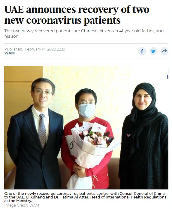 阿联酋通讯社(WAM)陪同中国驻阿联酋总领事李绪航和卫生部国际卫生条例负责人法蒂玛·阿特塔尔(Fatima Al Attar)博士拜访了父亲和儿子,对他们的康复表示祝贺。