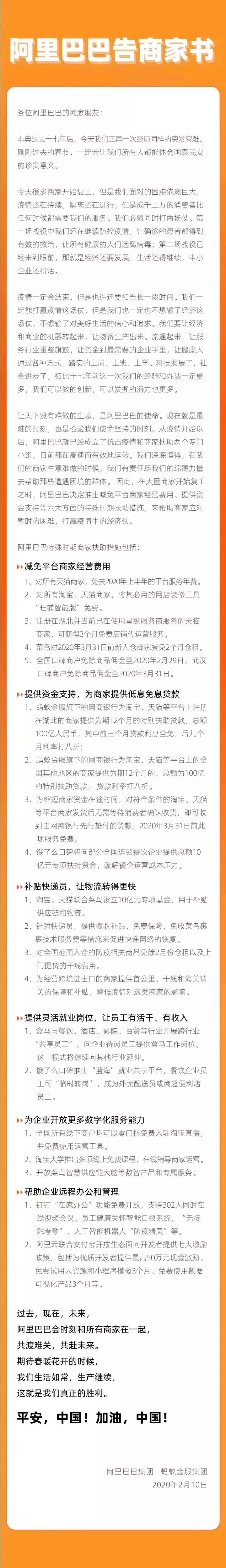 2月10日,阿里巴巴集团发布《阿里巴巴告商家书》,推出六大方面20项特殊措施,扶助中小企业发展。