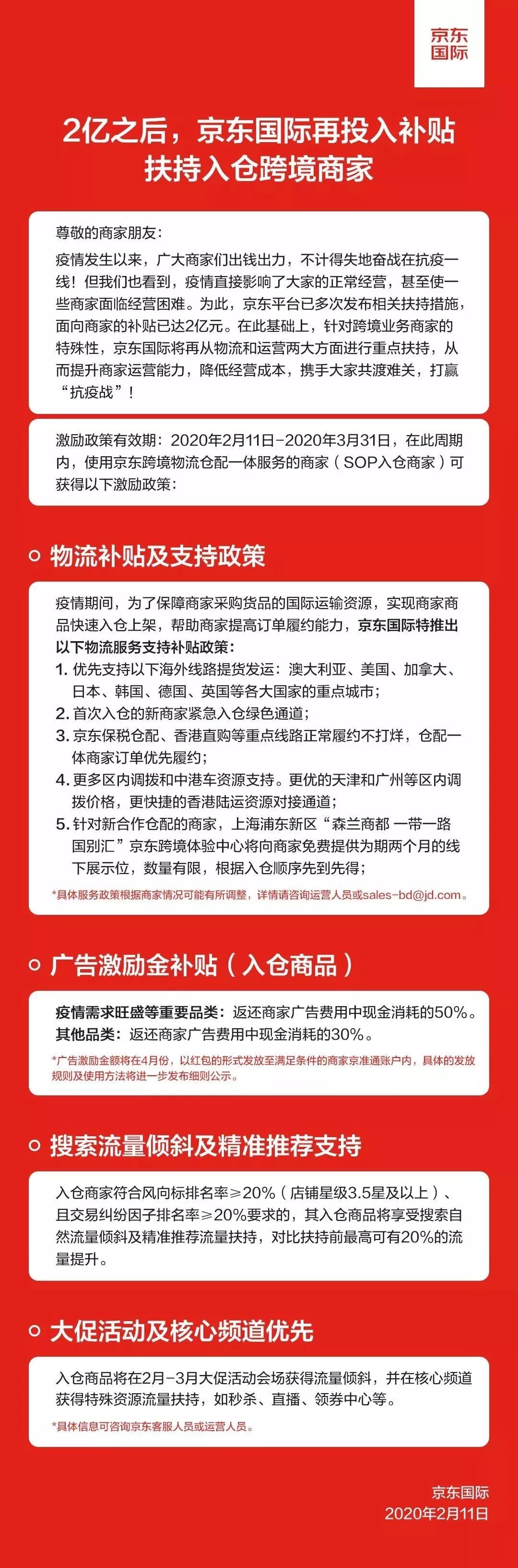 2月11日,亿欧获悉,京东国际宣布,2020年2月11日-2020年3月31日期间,将为京东跨境物流仓配一体服务的商家(SOP入仓商家)提供物流补贴及支持、广告激励金补贴、搜索流量倾斜及精准推荐支持、大促活动及核心频道优先共四项政策激励。