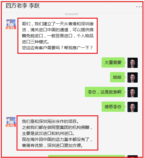 Mark也观察到大量的进口商品商家无论是北美地区、还是澳新、或是欧洲等地的跨境电商进口商家都在积极的帮中国的一些医院和希望捐赠给医院物资的善心人士组织海外防护物资资源,但目前最短缺的就是清关资源,而递四方集团也开通了全球到香港和到深圳的接货清关快速通道!简直是解决大家燃眉之急啊!递四方的创始人兼董事长李跃先生发微信给Mark透露了这个消息;所有的海外物资,如果能自行解决到香港或者委托递四方到香港,就有办法清关进入到国内了。如果有需要的话,可以直接联系Mark,Mark可以帮助对接到递四方的直接负责人,大家也可以自行找度娘,这样Mark就不用那么忙碌了。