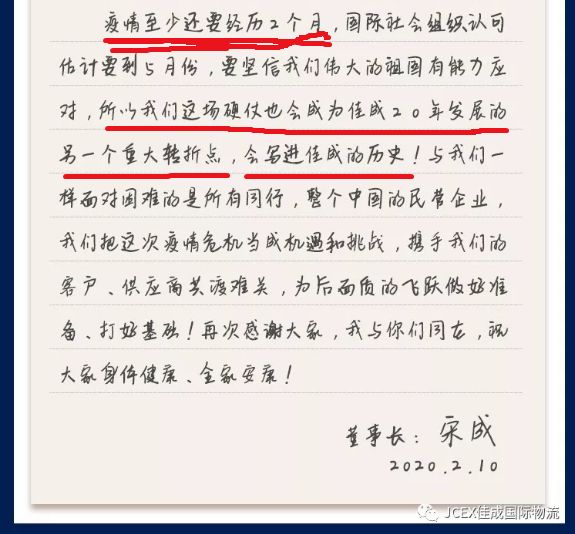 递四方集团此时推出这样的资源,体现了他们的责任心。据Mark了解,他们之前开通了到武汉和上海的绿色清关通道,并由递四方集团补贴了大量的运费!之前从全球揽收防护物资货物后,就直接投放到了武汉各大医院,作出了卓越的努力。 而正在努力的除了递四方,跨境电商业内还有很多公司都在行动,比如杭州的佳成物流也是,他们免费为大量的全球的捐赠企业和个人将医用防护物资运送到湖北和浙江,体现了一个有担当企业的责任感!近几天,佳成物流的董事长宋总给佳成员工写了一封家书!分享了他们20年来遇到的一些困难,特别是2008年的金融危机,他们借危机转变企业,获得了高速发展的动力。