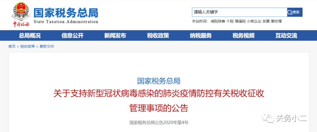 国家税务总局关于 支持新型冠状病毒感染的肺炎疫情防控 有关税收征收管理事项的公告 国家税务总局公告2020年第4号 为支持新型冠状病毒感染的肺炎疫情防控工作,贯彻落实相关税收政策,现就税收征收管理有关事项公告如下: 一、疫情防控重点保障物资生产企业按照《财政部 税务总局关于支持新型冠状病毒感染的肺炎疫情防控有关税收政策的公告》(2020年第8号,以下简称“8号公告”)第二条规定,适用增值税增量留抵退税政策的,应当在增值税纳税申报期内,完成本期增值税纳税申报后,向主管税务机关申请退还增量留抵税额。 二、纳税人按照8号公告和《财政部 税务总局关于支持新型冠状病毒感染的肺炎疫情防控有关捐赠税收政策的公告》(2020年第9号,以下简称“9号公告”)有关规定享受免征增值税、消费税优惠的,可自主进行免税申报,无需办理有关免税备案手续,但应将相关证明材料留存备查。 适用免税政策的纳税人在办理增值税纳税申报时,应当填写增值税纳税申报表及《增值税减免税申报明细表》相应栏次;在办理消费税纳税申报时,应当填写消费税纳税申报表及《本期减(免)税额明细表》相应栏次。 三、纳税人按照8号公告和9号公告有关规定适用免征增值税政策的,不得开具增值税专用发票;已开具增值税专用发票的,应当开具对应红字发票或者作废原发票,再按规定适用免征增值税政策并开具普通发票。 纳税人在疫情防控期间已经开具增值税专用发票,按照本公告规定应当开具对应红字发票而未及时开具的,可以先适用免征增值税政策,对应红字发票应当于相关免征增值税政策执行到期后1个月内完成开具。 四、在本公告发布前,纳税人已将适用免税政策的销售额、销售数量,按照征税销售额、销售数量进行增值税、消费税纳税申报的,可以选择更正当期申报或者在下期申报时调整。已征应予免征的增值税、消费税税款,可以予以退还或者分别抵减纳税人以后应缴纳的增值税、消费税税款。 五、疫情防控期间,纳税人通过电子税务局或者标准版国际贸易“单一窗口”出口退税平台等(以下简称“网上”)提交电子数据后,即可申请办理出口退(免)税备案、备案变更和相关证明。 税务机关受理上述退(免)税事项申请后,经核对电子数据无误的,即可办理备案、备案变更或者开具相关证明,并通过网上反馈方式及时将办理结果告知纳税人。纳税人需开具纸质证明的,税务机关可采取邮寄方式送达。确需到办税服务厅现场结清退(免)税款或者补缴税款的备案和证明事项,可通过预约办税等方式,分时分批前往税务机关办理。 六、疫情防控期间,纳税人的所有出口货物劳务、跨境应税行为,均可通过网上提交电子数据的方式申报出口退(免)税。税务机关受理申报后,经审核不存在涉嫌骗取出口退税等疑点的,即可办理出口退(免)税,并通过网上反馈方式及时将办理结果告知纳税人。 七、因疫情影响,纳税人未能在规定期限内申请开具相关证明或者申报出口退(免)税的,待收齐退(免)税凭证及相关电子信息后,即可向主管税务机关申请开具相关证明,或者申报办理退(免)税。 因疫情影响,纳税人无法在规定期限内收汇或办理不能收汇手续的,待收汇或办理不能收汇手续后,即可向主管税务机关申报办理退(免)税。 八、疫情防控结束后,纳税人应按照现行规定,向主管税务机关补报出口退(免)税应报送的纸质申报表、表单及相关资料。税务机关对补报的各项资料进行复核。 九、疫情防控重点保障物资生产企业按照8号公告第一条规定,适用一次性企业所得税税前扣除政策的,在优惠政策管理等方面参照《国家税务总局关于设备器具扣除有关企业所得税政策执行问题的公告》(2018年第46号)的规定执行。企业在纳税申报时将相关情况填入企业所得税纳税申报表“固定资产一次性扣除”行次。 十、受疫情影响较大的困难行业企业按照8号公告第四条规定,适用延长亏损结转年限政策的,应当在2020年度企业所得税汇算清缴时,通过电子税务局提交《适用延长亏损结转年限政策声明》(见附件)。 十一、纳税人适用8号公告有关规定享受免征增值税优惠的收入,相应免征城市维护建设税、教育费附加、地方教育附加。 十二、9号公告第一条所称“公益性社会组织”,是指依法取得公益性捐赠税前扣除资格的社会组织。 企业享受9号公告规定的全额税前扣除政策的,采取“自行判别、申报享受、相关资料留存备查”的方式,并将捐赠全额扣除情况填入企业所得税纳税申报表相应行次。个人享受9号公告规定的全额税前扣除政策的,按照《财政部 税务总局关于公益慈善事业捐赠个人所得税政策的公告》(2019年第99号)有关规定执行;其中,适用9号公告第二条规定的,在办理个人所得税税前扣除、填写《个人所得税公益慈善事业捐赠扣除明细表》时,应当在备注栏注明“直接捐赠”。 企业和个人取得承担疫情防治任务的医院开具的捐赠接收函,作为税前扣除依据自行留存备查。 十三、本公告自发布之日施行。 附件:适用延长亏损结转年限政策声明 国家税务总局 2020年2月10日