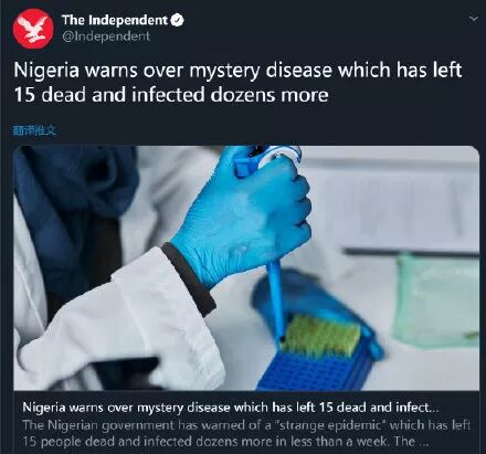 尼日利亚参议员消息报道称,当地截至上周一,已有至少104人感染「离奇本土病」,死者染病后2日内便不治身亡,国会已要求卫生部派遣专家前往疫情中心,以进一步了解这种疾病。 《华盛顿邮报》报道称,该组织还呼吁尼日利亚疾病控制中心(NCDC)建立监测措施,以遏制疫情的蔓延。卫生部长奥萨吉·埃哈内尔(Osagie Ehanire)在周五的简报中说,初期检测显示该疾病非埃博拉或是拉萨热,患者并未出现类似埃博拉、拉萨热(Lassa virus)等症状,而是西非曾经爆发过的两种可能致命的病毒。并且与新冠肺炎无关。世卫组织近日公布初步调查称,可排除病毒和细菌感染可能,推测或为杀虫剂中毒。此前还有怀疑称,或是由用于捕鱼的化学物导致。