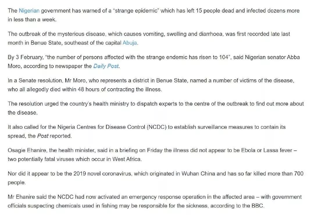 据尼日利亚知名媒体《Daily Post》报道,尼日利亚近日爆发一种神秘疾病,在不足一周内已造成过100人感染,并造成15人死亡。该疾病于2020年1月29日在尼Oyi-Obi社区爆发,患者均有头疼、发热、腹泻、呕吐、胃痛、身体无力和胃肿胀等症状,据报死者全部是在感染发病后48小时内死亡。