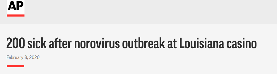 美联社报道说,该州卫生部门6日确认,在西南部查尔斯湖市(Lake Charles)一家赌场出现的病症与诺如病毒(norovirus)有关。诺如病毒能引起细菌性急性肠胃炎,传染性强,常见症状为腹泻、呕吐。该机构的地区医疗主任莱西·卡凡娜表示,这家赌场近期曾接纳数百人,其中至少200人自主报告出现了感染症状。她提到,对于出现症状的患者来说,直到症状消失后三个星期之内也能导致他人被传染。目前还不清楚病毒最初是如何扩散的,但卡凡娜认为“这不重要了”,现在已进入社区传染阶段。“所以,不管人们一开始如何在那里(赌场)被感染,他们已经将病毒带回家并传染给一个又一个的家庭成员,这才是我们今天真正需要传达的信息。”美联社称,为防止病毒进一步传播,卫生官员建议人们待在家里,认真洗手并以家用漂白清洁剂彻底消毒屋内区域。卫生部门要求,任何出现症状的人应填写一份网上调查。赌场方面则没有立即回应媒体置评请求。来源:驻外之家,北晚新视觉、中国新闻周刊,环球网等