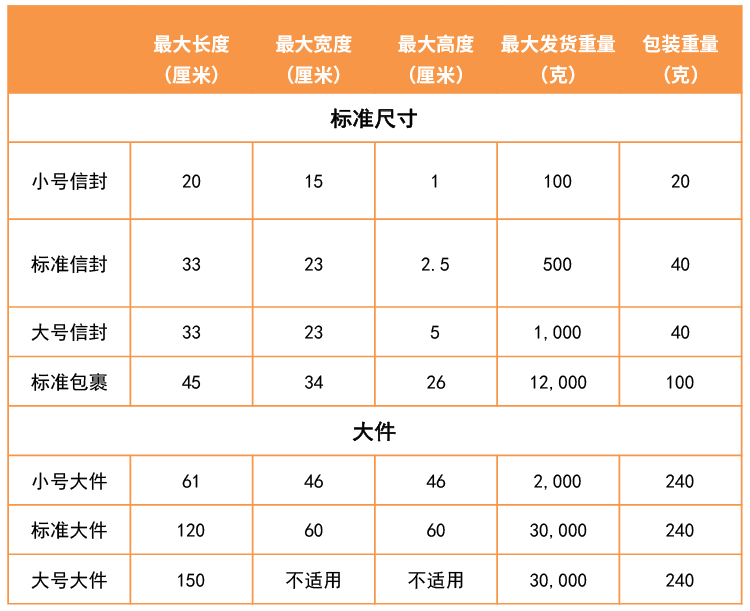 大件:包装后的商品重量和尺寸超过以下任何测量值的商品就是大件商品:重量12千克,最长边45厘米,次长边 34厘米,最短边26厘米。