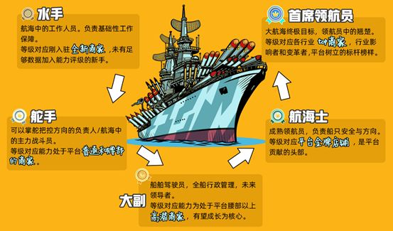 速卖通最新商家成长划分采取了游戏式晋级逻辑,新商家入驻速卖通后要从“水手“开始,往“舵手”、“大副”、“航海士”方向努力,终极目标是成为平台各行业的TOP商家,也就是“首席领航员”。