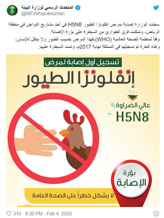 该病例是自2018年7月以来沙特阿拉伯首次爆发H5N8病毒。