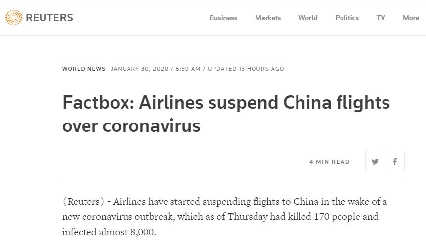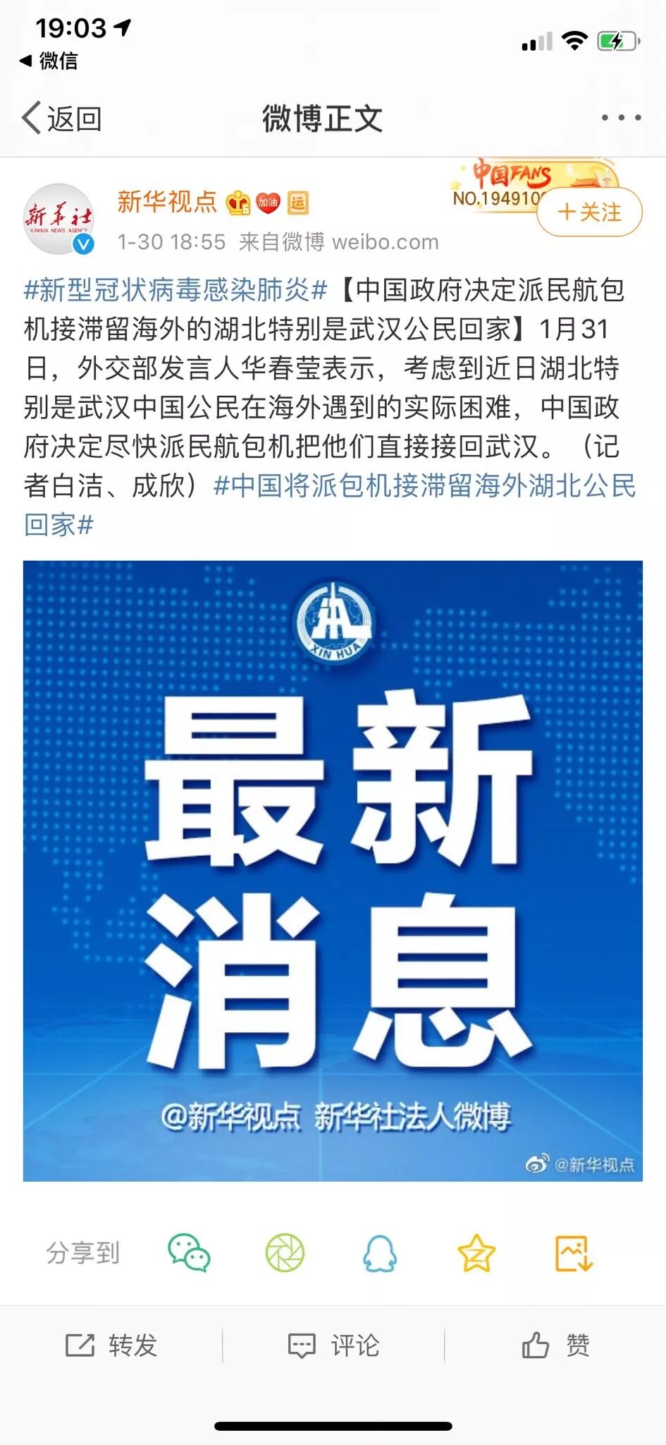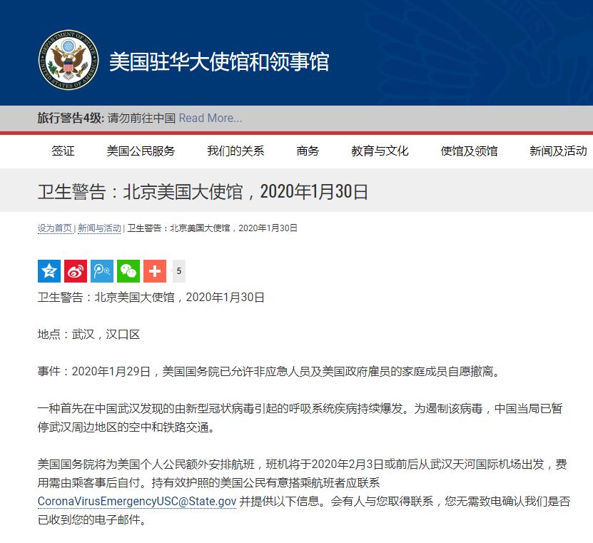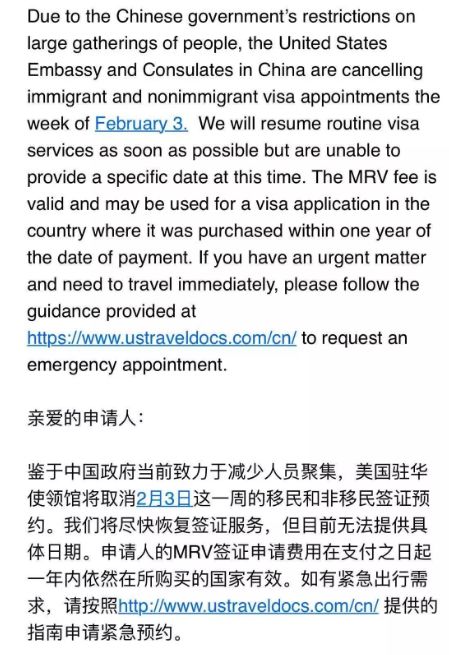 与此同时,美国三大航空公司 AA/UA/DELTA均宣布: 全面取消中美航班! 原先得知的消息,只是美航司取消部分中美航班。 没想到不过几日, 中美航班已遭全面取消。 01 中美航班全面取消 美西当地时间1月31日,据KTLA新闻报道,3家美国航司已经宣布: 暂停所有中美航班! 美国航空、达美航空、联合航空周五宣布,由于对致命的冠状病毒疫情的担忧日益加剧,将暂停所有中美之间的航班。 联合航空公司宣布将暂停飞往北京、上海和成都的航班,但继续飞往香港。 美国航空公司星期五宣布,从今日到3月27号,将暂停飞往中国大陆的航班。 该航空公司表示,它也将帮助受影响的客户处理退订机票事宜。 达美航空方便表示,最后一班飞往中国的航班将于2月3日起飞,最后一班飞往美国从中国飞往美国的航班将于2月5日起飞。 停飞将持续到4月30日,这家总部位于亚特兰大的航空公司宣布将提供住宿和退款。 除了美国航司,全球各国都在针对疫情做出调整。 为避免疫情持续扩大,全球各国加强国境管理,航空公司也纷纷调整往返中国航班,《路透社》整理资讯如下: 全球航司最全资讯 ●加拿大航空(AIR CANADA) 就在一天前,世界卫生组织宣布此次疫情为全球紧急状态。 世卫组织表示,大多数患者病情较轻,但有20%的患者出现了严重症状。 这种新型冠状病毒的症状包括发烧和咳嗽,在严重病例中,还会出现呼吸短促和肺炎。 而就在国民为武汉肺炎共同努力的时候, 却有一种“美国声音”发出: 所有中国赴美签证或全部暂停! 起因是美国国务院在30日发表声明, 允许中国境内非紧急工作人员 离开美驻华所有大使馆。 美国动作的第一步, 便是从武汉撤离 公民和大使馆工作人员 共计201名。 02 赴美签证将取消 美西时间2020年1月30日,据CNBC报道,美国国务院刚刚发布最新消息,批准美国驻北京大使馆所有非紧急情况的政府雇员及其家属离开,理由是目前新型冠状病毒仍在中国继续传播。 据美国国务院一位官员说,这项授权还适用于美国驻中国成都、广州、上海和沈阳的总领事馆。 这意味着,美国驻北京、上海、广州、成都、沈阳大使馆的所有外交人员和家属都可以离开中国。 持有效护照的美国公民有意搭乘航班者应联系 CoronaVirusEmergencyUSC@State.gov 并提供信息。 会有人与撤离人员取得联系。 “美国国务院做出决定,将美国大使馆和领事馆总领事置于授权离境状态,是出于对运输受限造成的后勤中断以及对这种新型冠状病毒相关的适当医疗服务的可获得性的高度警惕。” 北京美国大使馆还提醒称: 中国当局已经对武汉周边地区实行严格的旅行限制。旅行者应注意,中国可能会阻止他们进出湖北省的部分地区。 一般的签证业务或将全部停止,中国赴美签证或将无法进行正常审批。 此前大使馆发布消息,称由于中国延长春节假期到2月2日,美国驻华大使馆和所有总领事馆将于2020年1月30日和31日(周四和周五)闭馆,紧急美国公民服务将开放。 而据美中签证中心最新消息宣布, 2月3日这一周的所有赴美签证预约服务都已取消。 包括移民签证和非移民签证,恢复时间待定。 不幸中的万幸是: · 申请人的MRV签证申请费用在支付之日起一年内依然在所购买的国家有效。 ·如有紧急出行需求,请按照 http://www.ustraveldocs.com/cn/ 提供的指南申请紧急预约。 签证进度更新可查询: https://www.ustraveldocs.com/cn_zh/ 03 美国对华4级旅游警告 而美国驻华大使馆在1月31日发布对中国的旅行4级警告,要求在美居民请勿前往中国。 以下是大使馆官网原文: “鉴于首次在中国武汉发现的新型冠状病毒,请勿前往中国旅行。 1月30日,世界卫生组织已认定这次迅速蔓延的疫情构成国际关注的突发公共卫生事件。 旅行者应做好准备,在几乎没有或没有提前通知的情况下,会实施旅行限制。商业航空公司已经减少或暂停了往返中国的航线。 那些目前在中国的美国人应该考虑使用商业交通方式离开。鉴于这种新型冠状病毒,美国国务院已要求所有非必要的美国政府工作人员推迟前往中国。 为了遏制这种新型冠状病毒,中国当局已暂停了武汉周边地区的航空、公路和铁路旅行,并限制了全国范围的旅行和其他活动。 美国国务院于2020年1月23日命令所有非应急美国人员及其家属离开武汉。美国政府向湖北省的美国公民提供紧急服务的能力有限。 美国疾病控制与预防中心已经针对中国各地发出了旅行安全警告。 04 中国包机接武汉公民回家 北京当地时间1月30日,据外交部表示,考虑到湖北特别是武汉中国公民在海外遇到的实际困难,中国政府将尽快派民航包机把他们接回武汉。 一些正在等待从曼谷起飞的航班的人说,他们想回去照顾他们的亲人。 受感染的人不会立即表现出症状,但潜伏期同样可以传染病毒。 05 双黄连真有效? 而针对疫情的恐慌, 大家纷纷想要以药物寻求安全感。 这一次,双黄连口服液被点名,于是毫无意外的脱销了…… 此前,槟榔、藿香正气丸、中草药洗液“洁尔阴”、安宫牛黄丸都曾榜上有名…… 但, 有专门预防和食疗新型冠状病毒的药物吗? 没有! 双黄连口服液真的有效吗? 尚无证据! 所以切勿以讹传讹。 写在最后 面对疫情,我们并非束手无策。 上千万人监控的医疗中心火速建成, 专业权威的医疗团队 正在昼夜不停研究对症药物, 有爱团结的国人不断输送物资…… 没有什么是众志成城克服不了的。 我