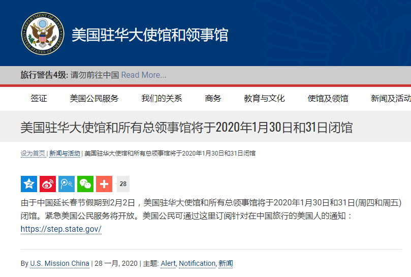 目前,因为中国春节,美国驻华大使馆和所有领事馆都处于闭馆状态。