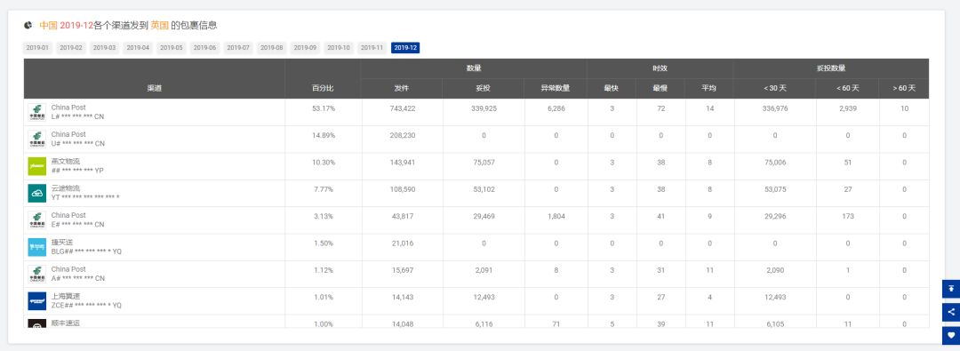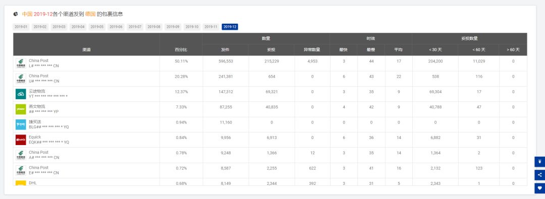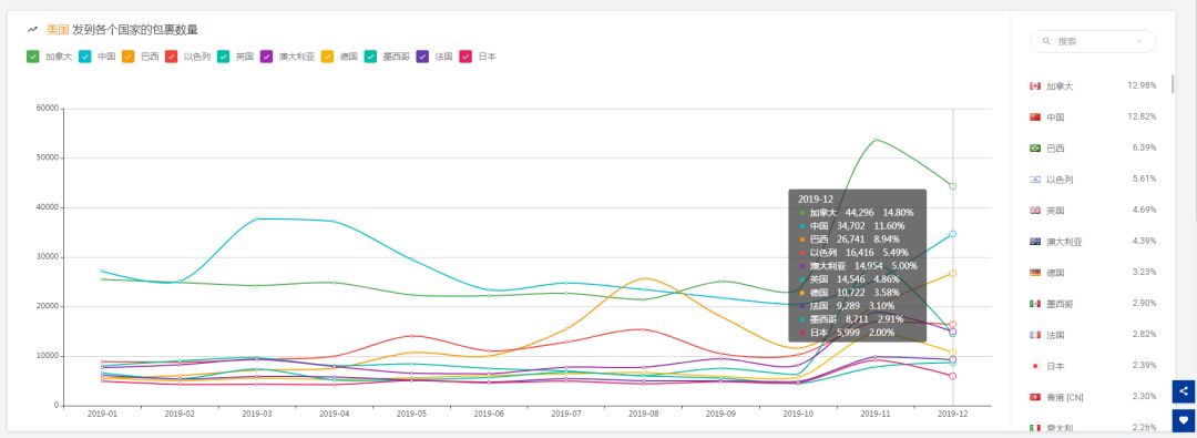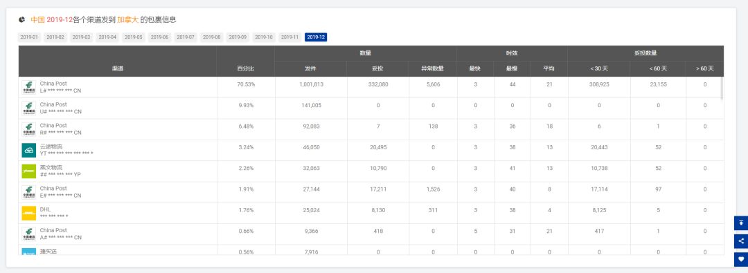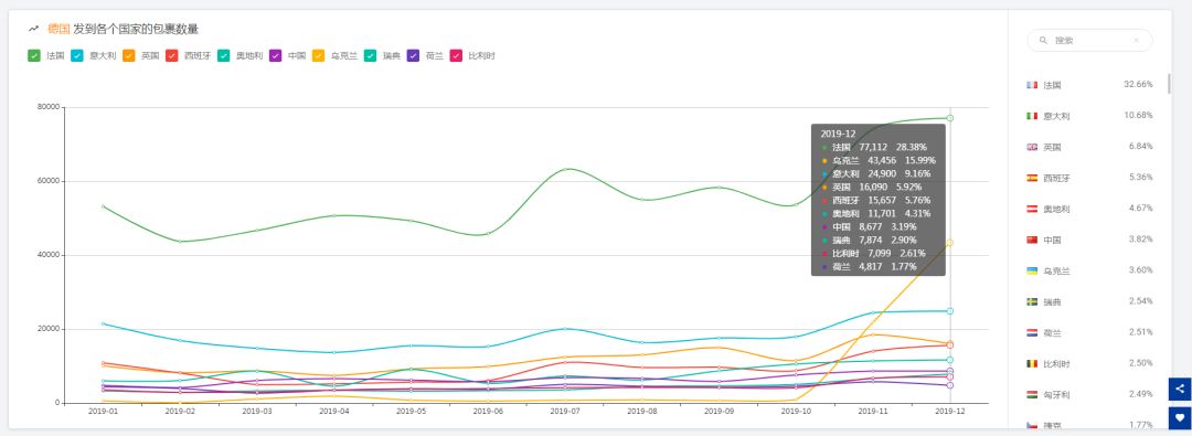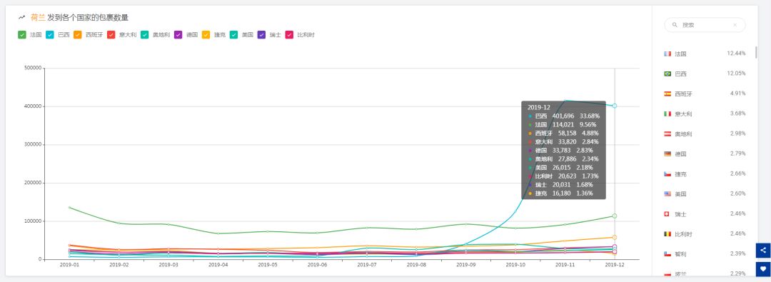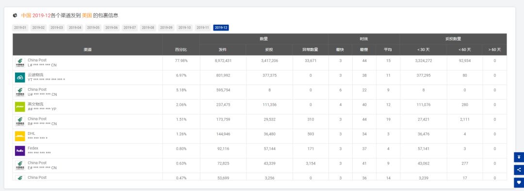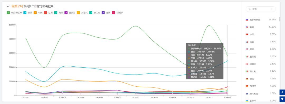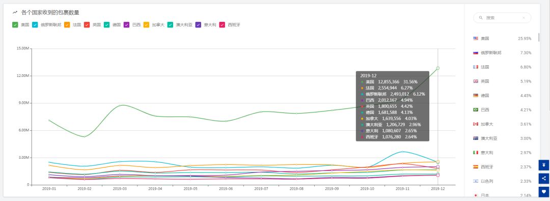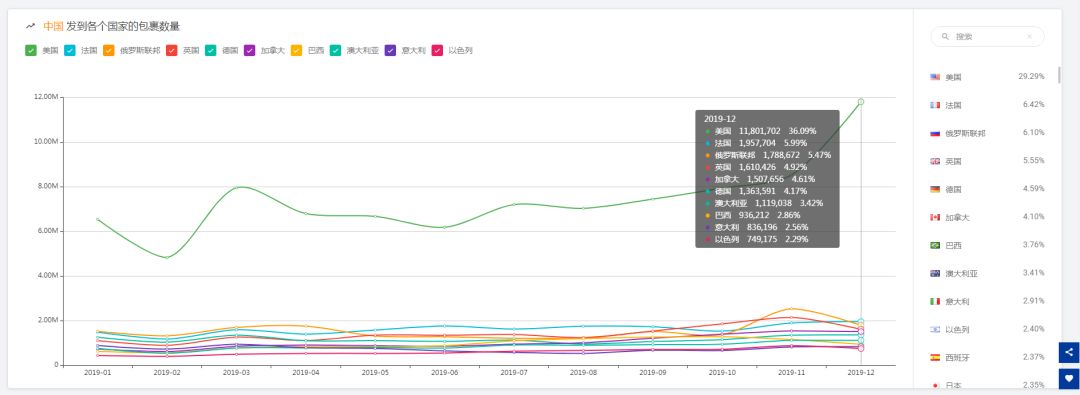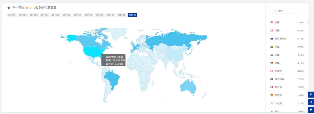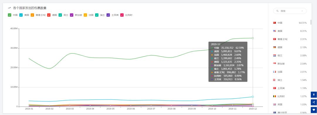 欢迎大家参考由17TRACK收录的全球跨境包裹数据分析!2019年12月,平台总共收录查询单号超过5,610万票,其中发件的国家及地区为212个、收件的国家及地区为226个。