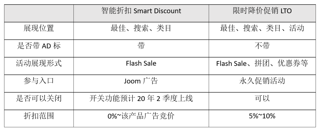 说到Flash Sale,可能有小伙伴要问了,智能折扣的Flash Sale和限时降价促销的Flash Sale有什么区别?小编做了一个表格对二者做了个简单对比。要注意的是,智能折扣和限时降价促销在部分场景下并不相容,所以平台会通过算法选择一种最佳形式进行折扣优惠,而不会叠加噢!