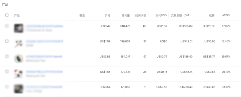 卖家可以在“折扣USD”一栏中看到该产品在智能折扣中总的折扣金额,我们拿列表中第一款产品举例,这款产品在广告活动中总共出单60个,而智能折扣总共给消费者省去了1.37美金的费用。