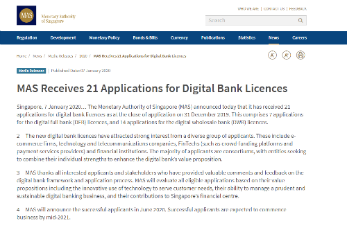 最新公告表示,21份申请中包括电子商务公司、科技企业、电信公司,金融科技公司(例如众筹平台和支付服务提供商)和金融机构。MAS将于2020年6月宣布成功申请者。成功申请者预计将于2021年中开展业务。