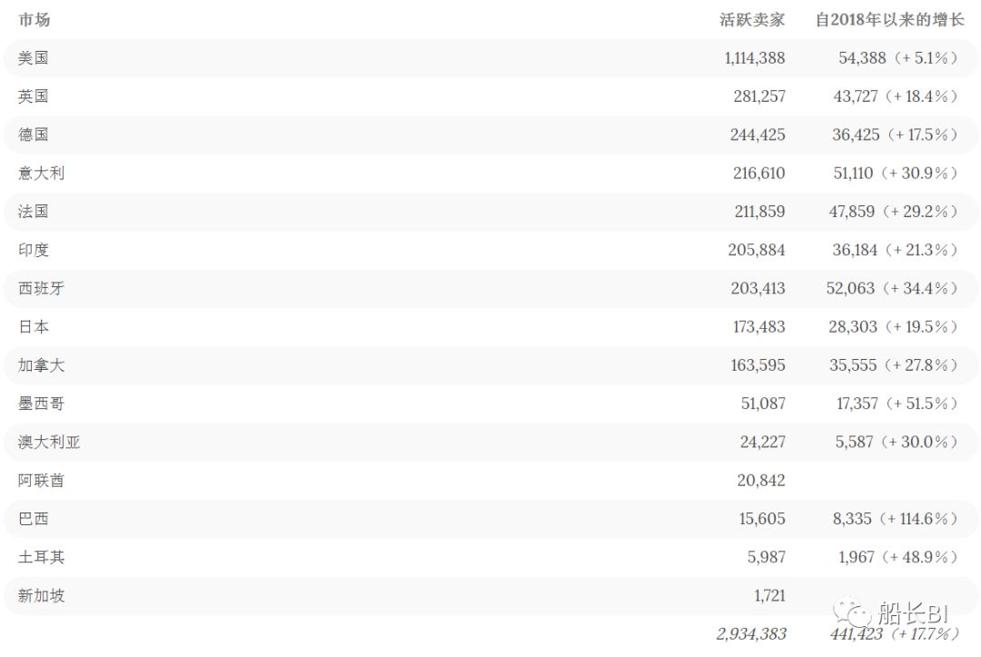 尽管亚马逊在市场上占据主导地位,但它的规模仍在不断扩大。2019年,它的活跃卖家达到了300万,每年增长17.7%。其中10%的年销售额超过了10万美元。通过在新加坡和阿拉伯联合酋长国的推出,它现在在全球经营着16个市场。2019年,美国卖家在亚马逊上卖出了超过21亿件商品,每分钟超过4000件。然而,它也有许多国际卖家,其中大部分来自中国。