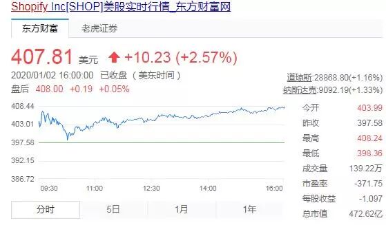 要说2019年股价走势强劲的股票,Shopify绝对算得上是当之无愧的一支。在过去的一年里,shopify股价一路高歌,累计涨幅超180%。目前,Shopify的407.81美元的股价较17美元的发行价已经上涨了近96%,460.76亿美元的市值也早已超过了对手eBay。