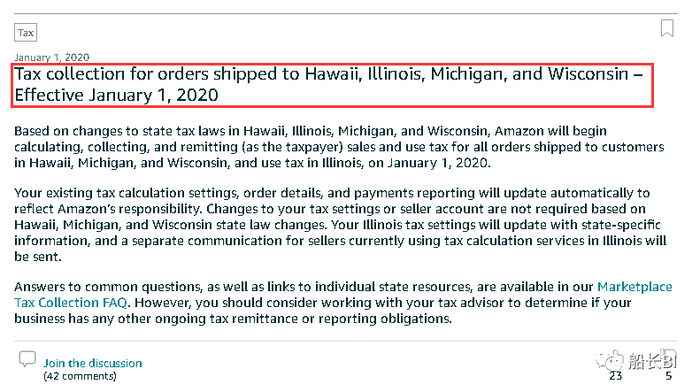 Part 1 政策变化 2020年1月1日起 亚马逊对运往以下这些地区的订单征税 船长BI获悉,据亚马逊本周三发布的消息称,从2020年1月1日起,对运往夏威夷、伊利诺伊州、密歇根州和威斯康星州的订单征税。 (图源亚马逊) 亚马逊表示,根据夏威夷,伊利诺伊州,密歇根州和威斯康星州的州税法的变化,将于2020年1月1日开始计算,收取和汇出(作为纳税人)所有发送给夏威夷、密歇根和威斯康辛州客户的订单的销售和使用税,以及伊利诺伊州的使用税。 卖家不需要更改自己的税务设置或账户,现有的税务计算设置、订单细节和付款报告将自动更新,以反映亚马逊的责任。 船长BI建议 卖家需要考虑与自己的税务顾问合作,以确定是否有任何其他正在进行的税务汇款或报告义务。 品牌政策更新 品牌名称使用新规范 上个月末,亚马逊更新了品牌政策,主要针对品牌名称使用的规范性。对于无品牌备案的卖家,将不能随便使用品牌名称。 (图源亚马逊) 亚马逊表示,卖家Listing的品牌属性应与生产该商品的品牌名称相匹配(例如,AmazonBasics商品应始终在Listing上显示“ by AmazonBasics”)。如果Listing不属于任何品牌,则品牌属性应为“ N / A”。 在列出带有新品牌属性的商品之前,卖家可能需要获得亚马逊的批准,需查看自己是否可能收到的潜在Listing错误代码列表及其相应的后续步骤。 船长BI建议 没有品牌备案的卖家,不要随便使用品牌名称,否则你的Listing可能被取消显示,按照亚马逊的要求进行操作。 有品牌备案计划的卖家,建议尽快注册商标完成品牌备案。也可参考:《新规!亚马逊更新品牌政策,卖家将受到这些影响》 亚马逊越来越重视品牌化,这也是未来的电商平台的必然趋势。因此,想要扩展自己的跨境业务,品牌将是必经之路。 2020年1月1日起 亚马逊电池商品销售实行新规定 船长BI了解到,对于销售电池类商品的卖家,自2020年1月1日起,必须按照联合国标准UN 38.3 提供锂电池测试摘要,这些新规适用于锂电池和内含锂电池的商品。 (图源亚马逊) 亚马逊表示,FBA卖家有责任为自己销售的任何ASIN获取此测试摘要。如果卖家不能提供,可能无法在亚马逊上销售此类商品。并且,亚马逊会把这些不符合要求的商品弃置处理,费用由卖家自己承担。 2020年1月1日起 亚马逊FBA库存绩效指标(IPI)新标准 早在2019年10月,船长BI就注意到,亚马逊向FBA卖家发出库存绩效指标调整的通知。自2020年1月1日起,亚马逊仓储限制的IPI分数指标将从350上调至400,仓储限制将继续每季度评估一次。 (图源亚马逊) 亚马逊表示,如果卖家的IPI分数在2019年12月23日那一周仍低于400,将在2020年第一季度对卖家实行仓储限制。 如何提高卖家库存绩效指标IPI分数,可参考:《史上最严FBA新规?亚马逊将对卖家实施严格的存储限制》。 此外,船长BI还注意到,亚马逊还发布了Q1长期仓储费库存清点的通知:2020年1月15日,将是亚马逊FBA计划的下一个长期仓储费库存清点日。 通知如下图: (图源亚马逊) 船长BI建议 避免产生长期仓储费,卖家要主动管理超龄库存,通过船长BI「冗余库存列表」查看即可超龄库存,并在下一个库存清点日之前移除超龄库存: 提交移除订单 为需要支付长期仓储费的库存设置自动移除 2020年1月1日起 欧洲本地税号不能用于欧盟境内B2B交易 船长BI获悉,上个月初,有很多卖家收到了亚马逊的邮件通知:欧洲本地税号将不能用于欧盟境内B2B的免税交易。 船长BI建议 如果欧洲卖家要进行欧盟境内的B2B的免税交易,建议尽快申请欧盟税号,还需提供每笔交易的发票。 2020年1月31日前 法国站卖家需上传VAT税号 欧洲站卖家一直备受VAT税务问题困扰。2019年有不少卖家因为VAT关店。新的一年,欧洲各国的VAT税务政策将开始收紧。以法国站为例,符合条件的卖家也需要尽快上传VAT税号了。 (图源卖家收到的邮件通知) 亚马逊表示,需在2020年1月31日之前向法国税务机构提供有关卖家亚马逊业务的特定数据。包括税务信息,如卖家的法国VAT税号。 船长BI建议 对于公司在法国境外、在法国境内存储库存并配送订单以及从存储库存的另一欧盟国家或地区向法国买家配送商品,且每年销售总金额超过3.5万欧元的卖家尽快注册并上传VAT税号至亚马逊卖家平台。 2020年2月18日起 亚马逊FBA费用和销售佣金变更 相信很多卖家已经有所了解,亚马逊将从2月18日起,FBA费用和销售佣金将进行变更。 (图源亚马逊) 2020年3月1日起 日亚站推出销售佣金优惠活动 亚马逊在对FBA费用和销售佣金做出变更的同时,船长BI了解到,日亚站也将推出了一项降低某些分类的销售佣金的优惠活动。 (图源亚马逊日本站部分品类佣金优惠信息) 促销活动将2020年3月1日开始,一直持续到2021年2月28日。服装与配饰及鞋包品类佣金优惠示例可参考上图。 2020年4月1日起 亚马逊启动FBA New Selection计划 船长BI获悉,据亚马逊此前更新的消息称,将推出FBA New Selection Program(FBA新选品计划)。 (图源亚马逊帮助页面) 亚马逊表示,从2020年4月1日开始,参与FBA New Selection计划的卖家将有资格获得免费的月度仓储、免费搬运和对符合条件的新FBA ASIN的免费退货处理。此外,FBA的新手也将有资格获得Amazon Partnered Carrier配送优惠100美元的折扣。 ASIN 资格 1)卖家IPI库存绩效高于400,不受仓储限制。 2)只有小号标准尺寸和大号标准尺寸商品符合计划条件。 3)父 ASIN 必须是亚马逊物流的新品。 4)媒介类商品分