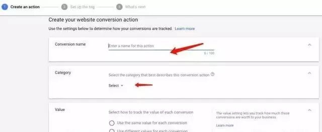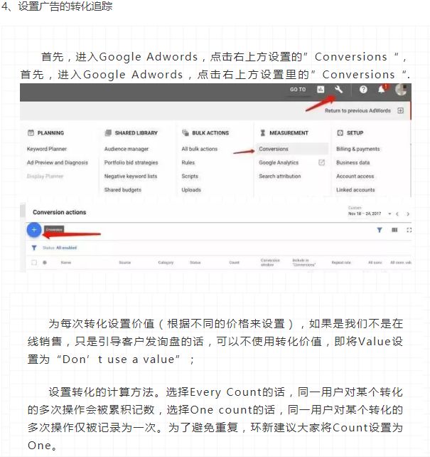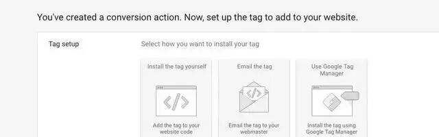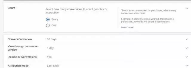 再根据实际情况设置”Conversion window”(跟踪转化的时间范围),”view-through conversion window”(在广告展示后多长时间去追踪浏览型转化),”Include in Conversion”(是否将设置的此转化加入Adwords的总Conversion中)和”Attribution model”。然后,点击”Creat and Continue”。 最后,在网站上正确安装转化代码。有以下三种方法可选。常用的是第三种。安装完代码,点击Done就ok了。