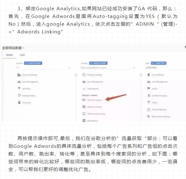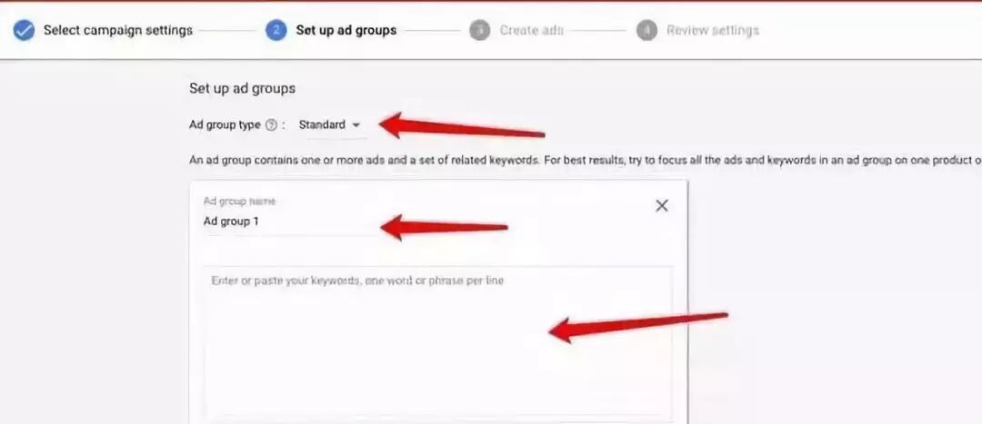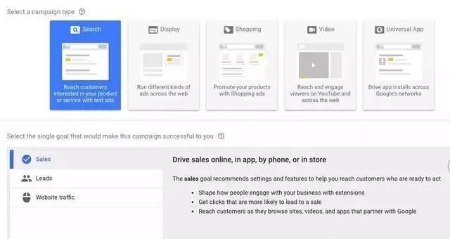 Google Adwords可以投放五种类型的广告,分别是:搜索广告(Search)、展示广告(Display)、购物广告(Shopping)、视频广告(Video)、应用推广广告(Universal app)。 搜索广告:即有人搜索才展示的广告,当用户对某些关键词进行搜索时,相应的文字广告会出现在用户的搜索结果中(可设置仅限谷歌搜索引擎或者也包括谷歌的合作伙伴)。 工作原理即根据用户搜索的字词或词组来与广告设置的关键词进行匹配,相匹配且质量较高的广告可能会在用户搜索结果中得到展示。比如你销售truck,就可以在 AdWords 广告系列中将“purchase truck”添加为关键字。当用户在 Google 搜索中输入“purchase truck”时,你的广告就可能会出现在搜索结果页上。 另外,在设置搜索广告的时候,还可以选择同时添加展示广告,来扩大覆盖面。 展示广告:即向广告投放者定位的特定群体或网站展示广告,使广告出现在众多网站、移动应用和视频内容中。(Google展示广告网络包含 200 万家网站,覆盖全球 90% 以上的互联网用户)。展示广告可以设置自适应广告、图片广告、互动广告、Gmail广告等。 • 投放者可以按照特定受众群体来有针对性的展示广告,例如:曾经访问过网站的用户,将产品加入购物车但未下单的用户,可能有意向购买特定产品的用户,具有明显受众特征的用户(比如年轻妈妈)等。 1、设置广告系列 点击添加“广告系列”—>选择”Search”广告系列类型—>设置广告系列的目标—>添加网站,然后点击CONTINUE即可。 接下来,设置好广告系列的 名称,投放地点,目标语言,每日预算,截止日期,广告系列级别的附加链接、宣传信息、电话信息等 2、设置广告组 如上图所示,依次选择广告组类型(标准或者动态),设置广告组名称,添加触发广告的关键词。然后点击保存并继续即可,对于关键词的匹配类型,重点强调一下: 关键词的匹配类型有以下几种:①广泛匹配(broad match):即不加任何符号的关键词,比如 purchase truck,对于广泛匹配的关键词,当用户搜索词中包含关键字的错拼形式、同义词、相关搜索字词或其他相关变体时,都可以触发广告的展示。在此例中,用户搜索 how to purchase truck,purchase truck website,purchase cheap truck时,广告都有可能触发。 ②词组匹配(phrase match):即放在双引号里的关键词,比如”purchase truck”,对于词组匹配的关键词,当用户使用的搜索词与此词组匹配,或者是该词组的紧密变体形式,或者是在此词组的前面或后面加上了其他字词,都可以触发广告的展示。但是,如果词组之间插入别的词,或词组中词的顺序不同,广告都不会显示。此例中,搜索 purchase truck>③完全匹配(exact match):即放在方括号里的关键词,比如[purchase truck],对于完全匹配的关键词,只有当用户的搜索词与这个关键词完全匹配,或者搜索词是该关键词的紧密变体形式(比如仅仅是增加或删除了介词、连词等不影响搜索意图的词或字词顺序发生改变的关键词)时,广告才有可能触发展示,对于此例,搜索词truck purchase,purchase a truck,truck for purchase都可以触发广告的展示。 ④使用广泛匹配修饰符的关键词(注意:+词之间没有空格。)广泛匹配修饰符(broad match modifier)即加号+,用于修饰广泛匹配关键词。当搜索内容是此类关键词的近似变体(不包含同义词)或任何顺序的组合时,广告都可以触发展示。比如对于关键词 +purchase +truck。当用户搜索truck purchase,purchase cheap trucks,truck purchasing时,相应广告都可以触发展示,搜索同义词buy truck,广告则不会展示,(相比较广泛匹配关键词,它可以有更多的控制;相比较词组匹配的关键词,它又更自由,灵活性更强。) ⑤否定匹配(Negative match )否定匹配即不想让它触发广告的关键词。比如你是一家帽子公司,但是你不卖baseball hats,那就可以将 “-baseball hats”作为一个否定匹配关键词加入到广告组或广告系列里,当用户搜索baseball hats,你的广告将不会被触发展示了。再比如,如果你出口卡车,但是你不想卖便宜的,想卡掉cheap这个词,那就可以将cheap作为否定关键词,并设置为广泛匹配,后面当用户搜索任何带cheap的卡车相关词时,你的广告都不会被展示。