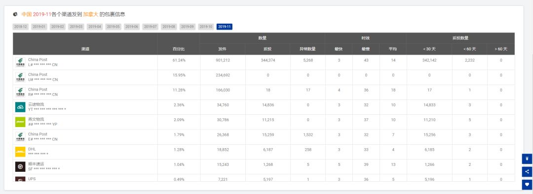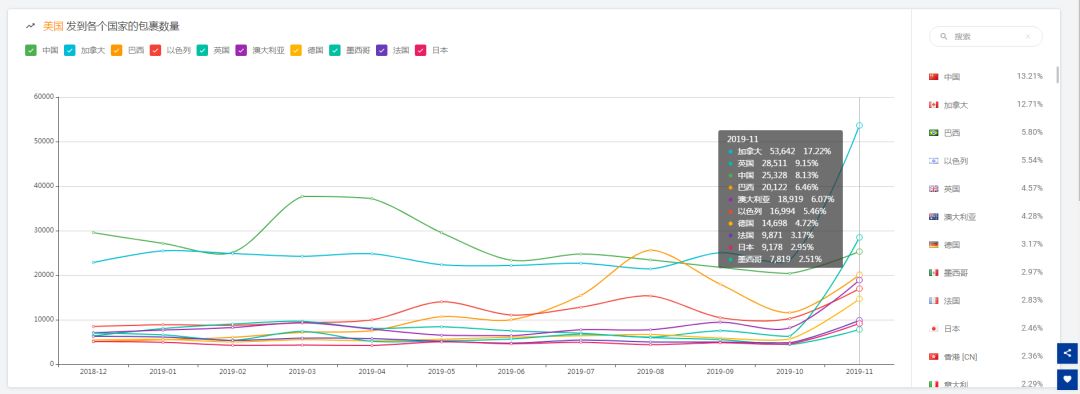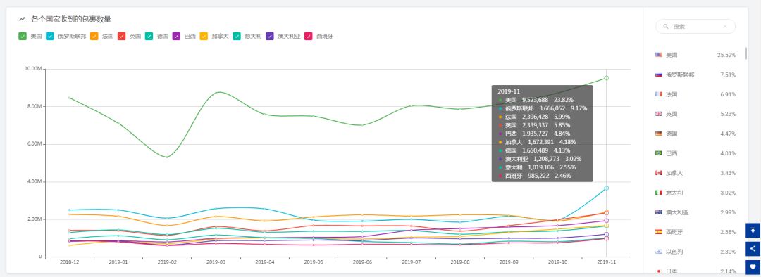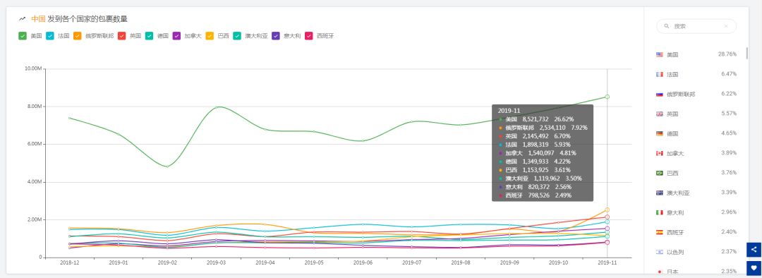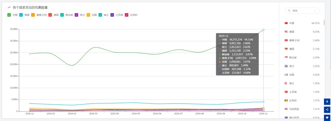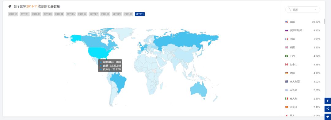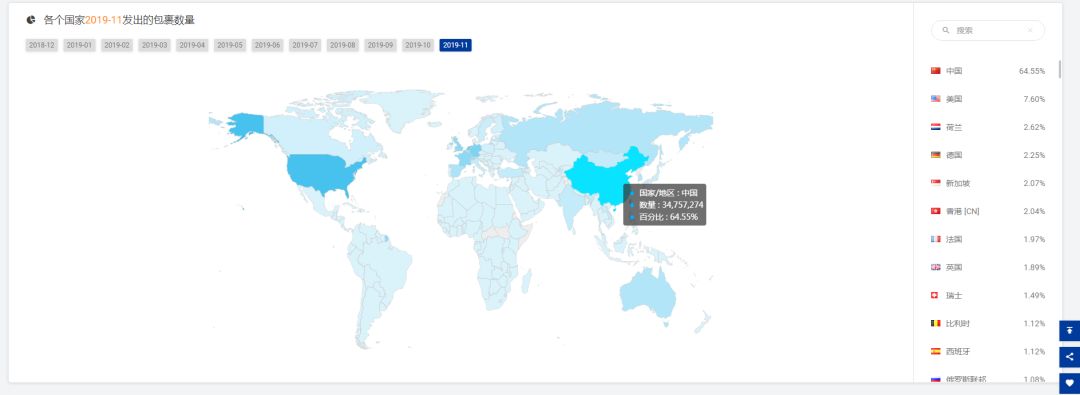 欢迎大家参考由17TRACK收录的全球跨境包裹数据分析!2019年11月,平台总共收录查询单号超过5,380万票,其中发件的国家及地区为212个、收件的国家及地区为227个。