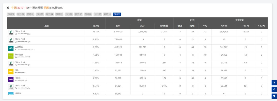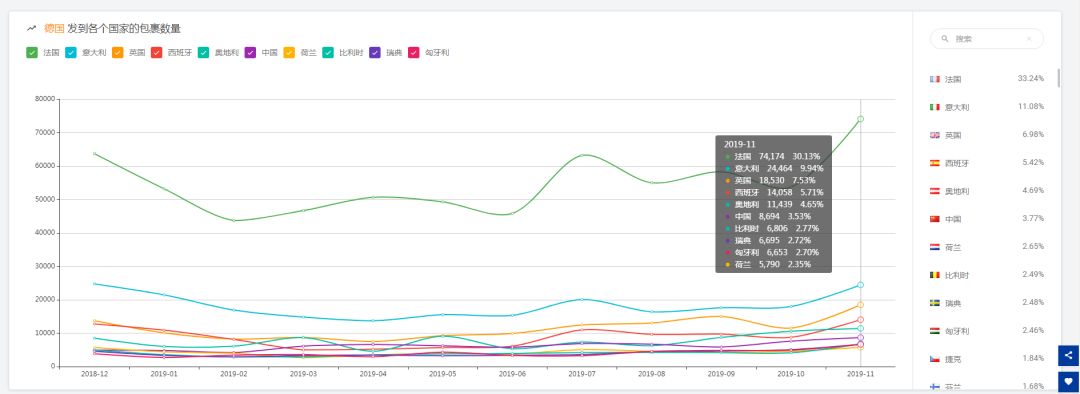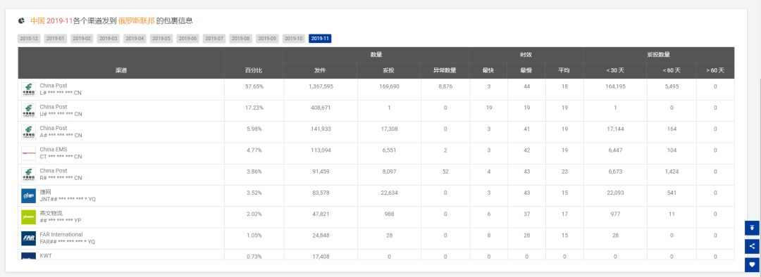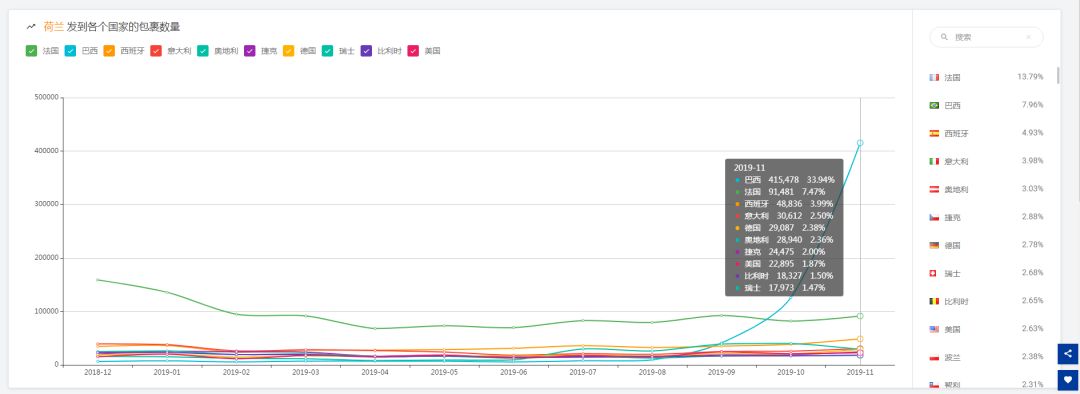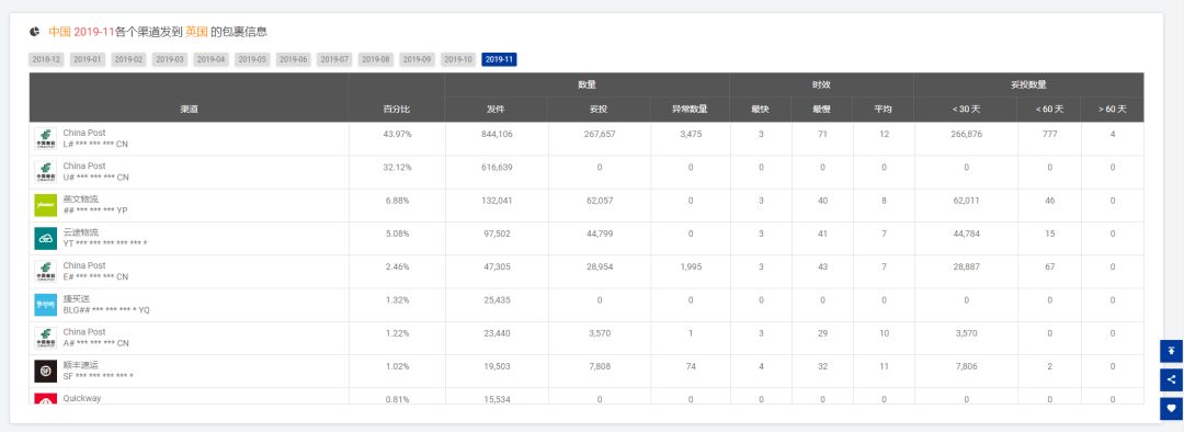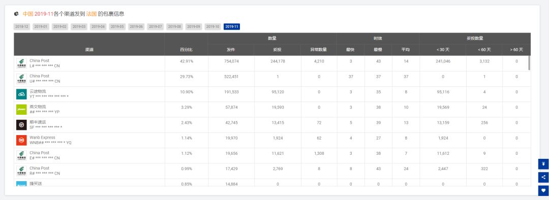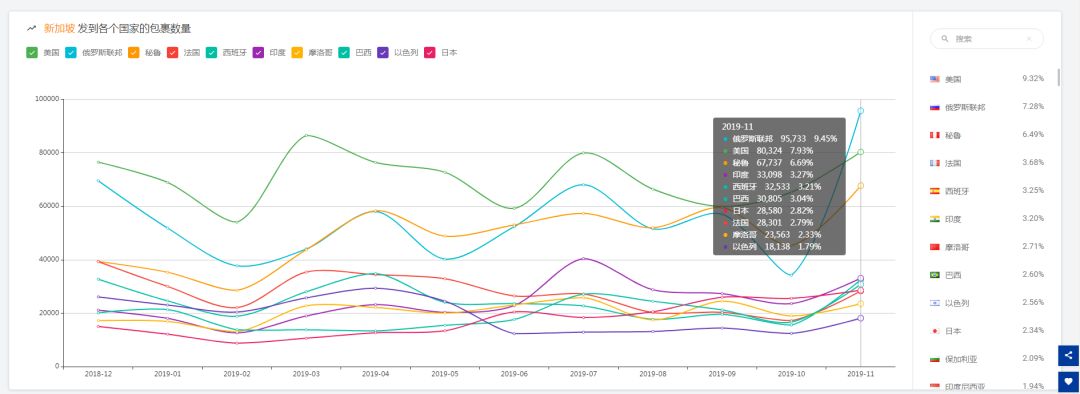 欢迎大家参考由17TRACK收录的全球跨境包裹数据分析!2019年11月,平台总共收录查询单号超过5,380万票,其中发件的国家及地区为212个、收件的国家及地区为227个。