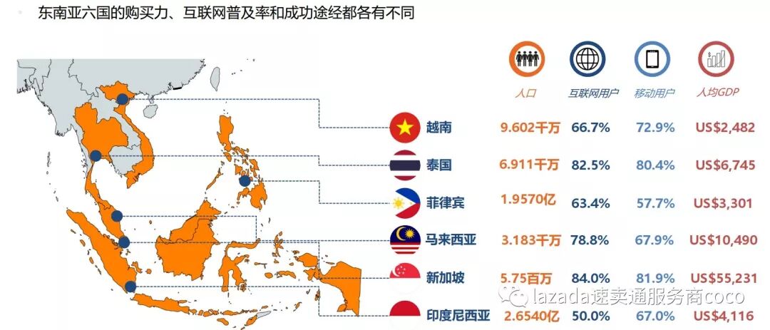 什么Lazada?2012年,Lazada在东南亚本土成立,中文名为来赞达,总部设在新加坡。2016年,阿里巴巴开始投资Lazada,2017年增资并全面控股,并在平台、产品、物流等各个方面对Lazada进行了升级改造和赋能。如今Lazada在印度尼西亚、马来西亚、菲律宾、新加坡、泰国及越南6个国家设有分部。![]()