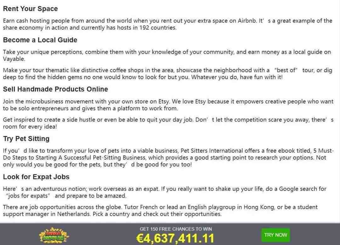 出租房屋、当地陪导游、网上售卖手工艺品、帮人看护宠物、找一份外籍工作。每个方法其实都介绍得很简洁,让人看完依然觉得无从下手,于是紧接着在这条新闻的分割线下面又出现了另一条与上方看上去有点关联的新闻。
