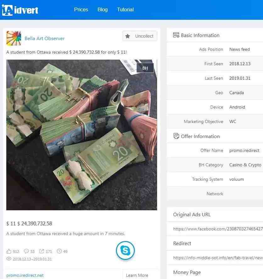 首先看文案,十分简单,但信息量很大,一个渥太华的学生只花了11美元就获得了2.4亿美元。11美元变2亿,对,没有看错,而且还是个学生,这对一般的受众来说绝对能勾起巨大的好奇心,是买彩票吗?还是有别的什么门路呢?描述看上去像一条新闻,让人忍不住想去探查真相。图片素材是成捆的现金,似乎增加了真实性。再看下面的文案,补充道,获得这些钱只用了7分钟。怎么可能有这么好的事?难道真的天上会掉馅饼吗?带着疑问我们来到了这个offer的money page。