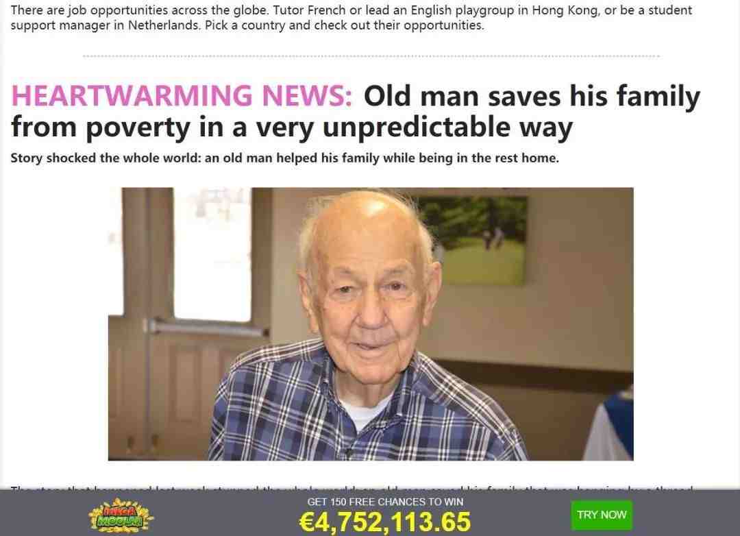 上面刚刚介绍了一些不痛不痒的所谓退休后赚钱的方法,下面就来了个老人实现脱贫且震惊到世界的新闻,但又不告诉你到底是什么方法做到的。这让有赚钱想法的同类人产生了极大的兴趣去了解,想要接着往下看,到底是什么样的方式竟然可以让一个养老院的老人获得足以让全家摆脱贫困的财富?