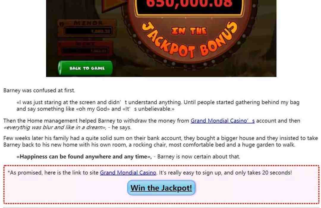 所以这里的知识点是,告诉大家这个游戏是真实的,而且可以提现,同时给人希望,连什么都不懂的老人都能获得这样的幸运改变人生,那其他人也同样可以期待一份这样的幸运。如何获得?自然是来玩这个同款游戏,注册也很简单,是要20秒,Win the Jackpot给了受众志在必得的信心。