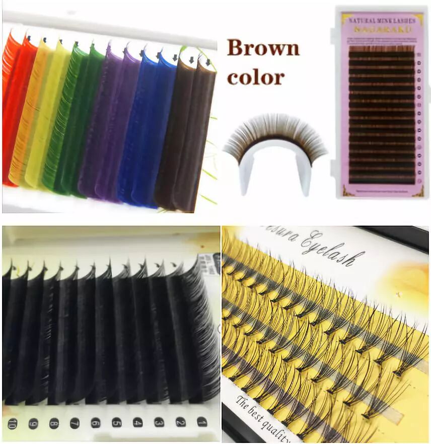 嫁接睫毛颜色较丰富,彩色盘,棕色系,黑色系,规格则可分为单簇及整条