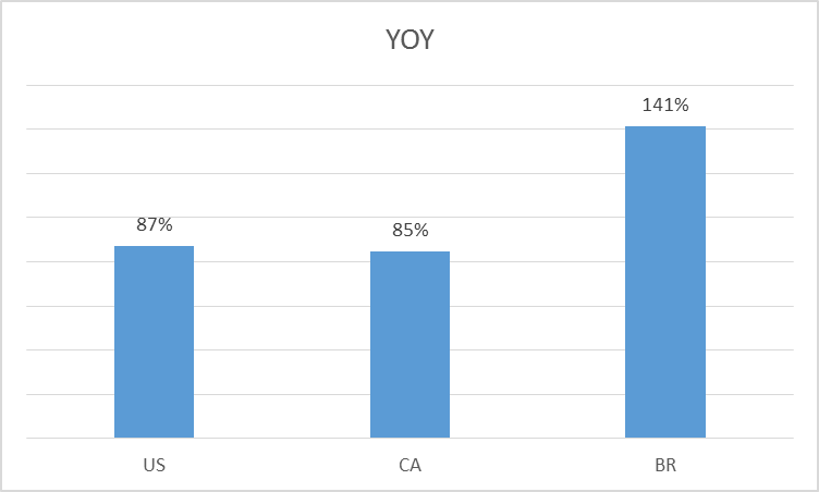 敦煌网平台假睫毛主要销售国家中,美国占比超过80%,订单主要以批发为主,平均客单价在$85,TOP10的国家中美国,巴西,加拿大增长最快。