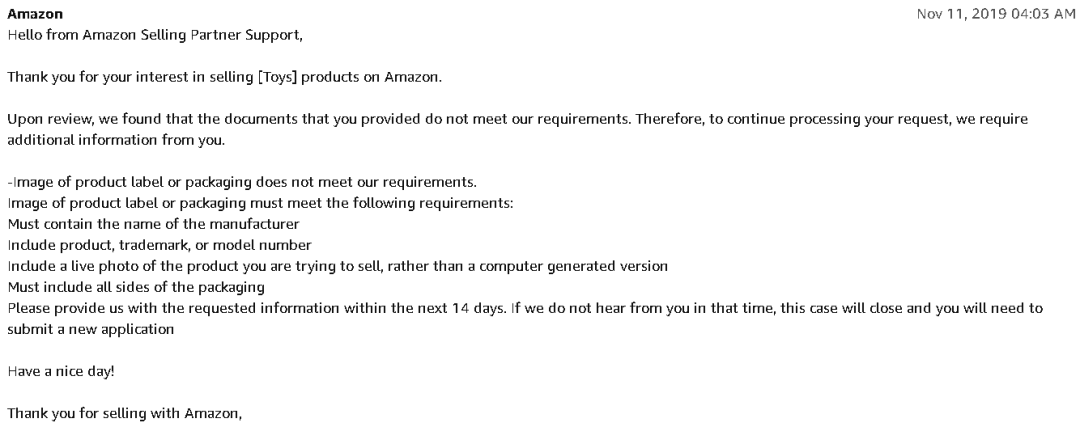 第二天早上,亚马逊就回复了,但是他说我的文件不符合要求!这样来回了两次,都说文件不符合要求,感觉像是看都没看我的文件,他的回复如下: