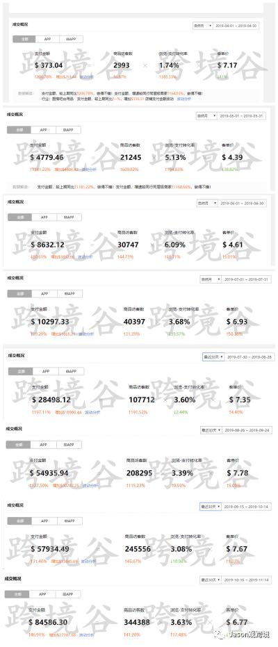 第二个要介绍的案例是2019合作的,一家做家居收纳的店铺,平均客单价3到7美金,合作前每个月三四百美金左右,经过一段时间店铺分析,诊断,选品,等等,店铺销量日新月异,每个月都有大幅度上涨,再加上速卖通双十一大促等等,在十一月份的时候,店铺交易额达到了8万4千美金。