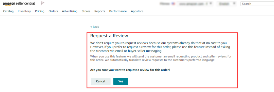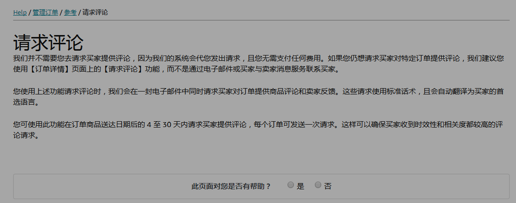 (图源亚马逊) 点开该按钮会跳出如下图中的内容提示,亚马逊表示,不需要卖家发邮件向买家索评,因为系统会代卖家发出请求,如果卖家希望对特定的订单向买家索评,建议使用“request a review”功能进行索评。 (图源亚马逊) 然而,这看起来似乎是个好消息,但实际上并不是所有订单都可用。亚马逊在其帮助页面上对此做了说明,需要在订单商品送达日期后的4至30天内才可以请求买家提供评论,并且每个订单可发送一次请求,这样做是为了确保买家收到的时效性和相关度都较高的评论请求。 (图源亚马逊) 相信很多卖家都有注意到,美国、日本等站点都相继发生了这一变化。不过,没多久,亚马逊就撤下了该按钮。这或许意味着,该功能目前可能已经开始内测。值得注意的是,亚马逊并未说明不允许卖家自己发邮件进行索评,而是平台会为卖家代发索评邮件,通过使用“request a review”功能即可实现。 船长BI作为亚马逊SPN服务商,并已入驻亚马逊商店,数据安全有保障,索评功能可以继续安全使用。 关于索评,这在亚马逊圈已经是老生常谈的话题了,索评并不是单纯给买家发一封邮件那么简单,有很多细节都会影响到效果,索评不到位极大可能会引来差评。 撇去索评发送频率,一般只发送一次。 在索评前,卖家需注意以下几点: 1、不要直接向买家索要好评:亚马逊只是鼓励买家来留评,而不是留好评; 2、索评邮件的主题/标题:可以结合不同的场合进行设置,比如感谢购买、使用教程、提供售后服务等,提高索取好评的成功率。 3、索评邮件的内容/模板:站在客户的角度去考虑,邮件内容以询问客户体验为主,如果亚马逊推出前文提到的索评功能,可以参考其模板。 4、索评邮件的发送时间:北美、欧洲地区就需要特别注意时差,根据亚马逊的说法,在买家订单送达后的4到30天内发送索评邮件为宜。有经验的卖家反馈表示,在当地时间早上10点左右发回复率最高。