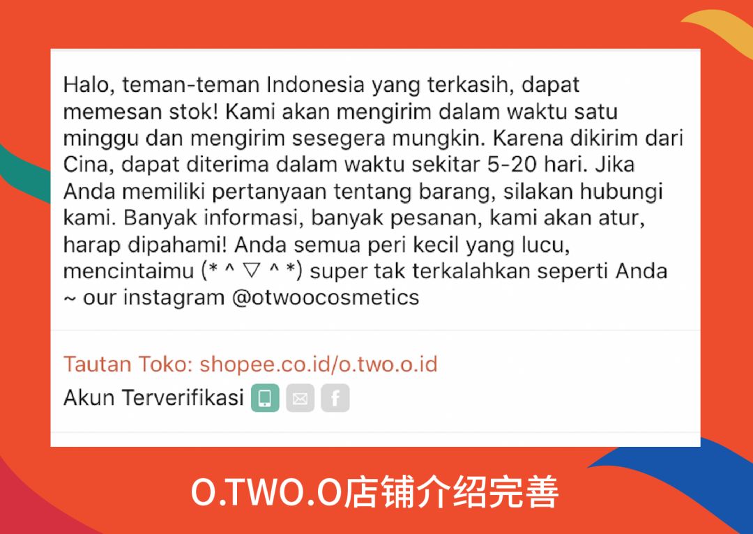 译:您好,亲爱的印尼朋友,欢迎订购商品!我们将在一周内尽快寄出。店铺是从中国发货,商品一般在5-20天内收到。如果您对商品有疑问,请与我们联系。店铺信息很多,订单很多,我们将尽快安排,请谅解!你们都是可爱的小仙女,爱你(* ^▽^ *)像你一样超级无敌〜我们的Instagram @otwoocosmetics
