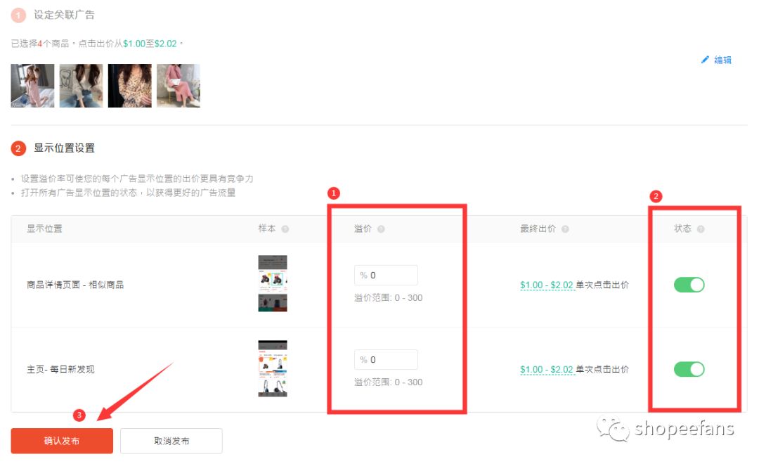 透过曝光加权比,卖家可以在广告设置期间提高每个版位的出价,以获得更好的广告流量