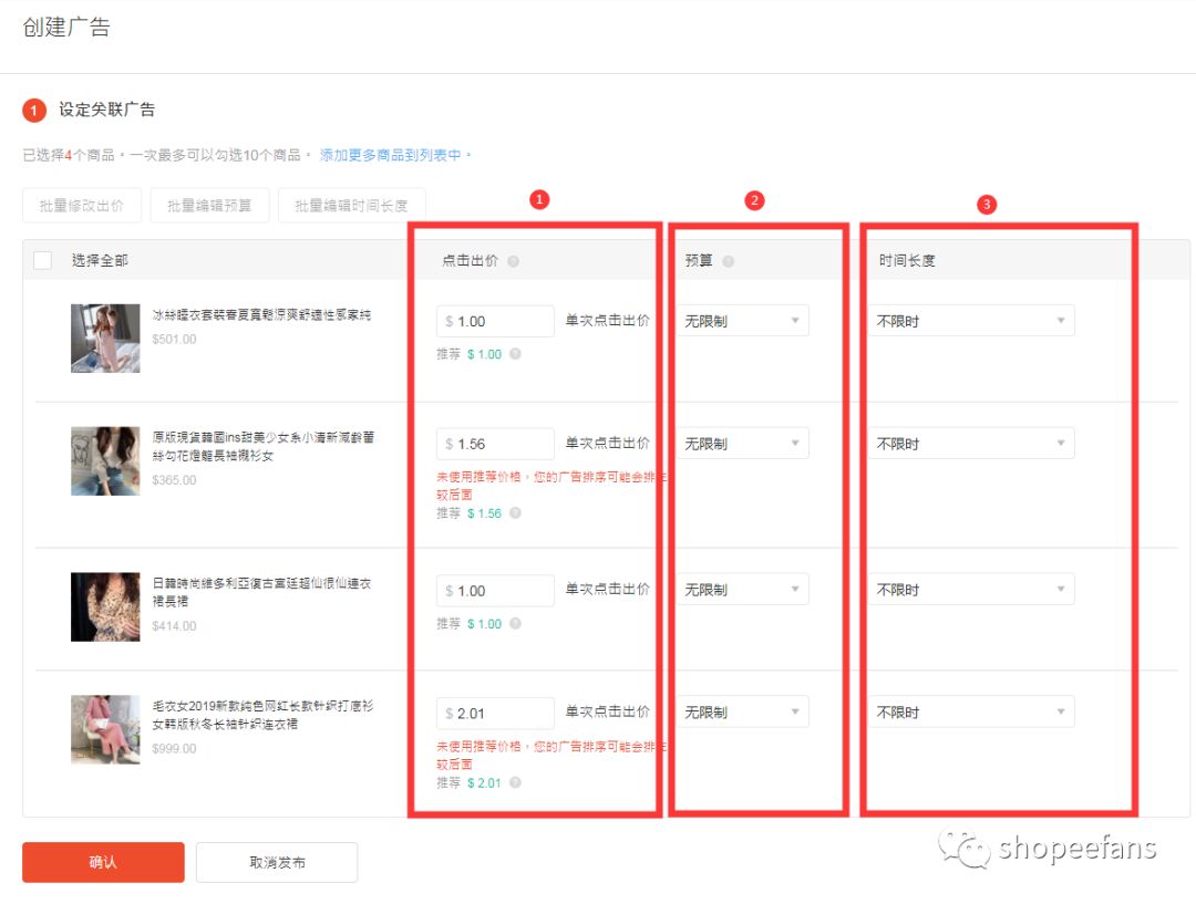关联广告预设为"没有预算限制"以及"没有时间限制"。卖家可以维持使用这样的设定如果希望商品获得充足的曝光。