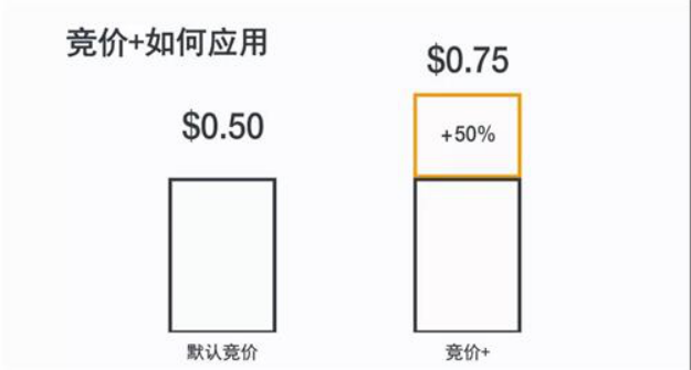 使用“竞价+”功能,可提升广告在搜索结果中置顶的几率。对于有资格在搜索结果页面顶部显示的所有广告,亚马逊会将您的单次点击竞价最高上调50%。例如,如果您的默认竞价是 $0.50,“竞价+”最高可将您的竞价提升至 $0.75,以完成搜索结果靠前位置的曝光量。