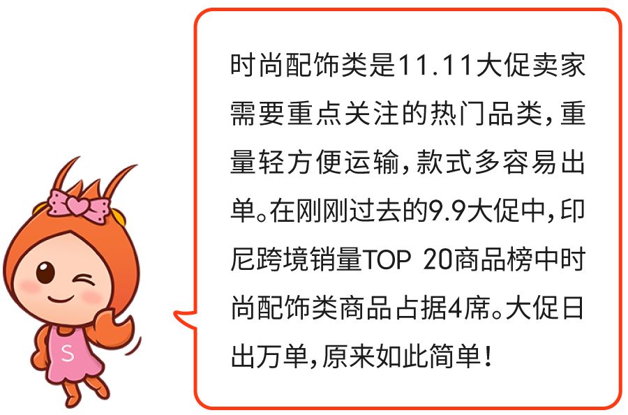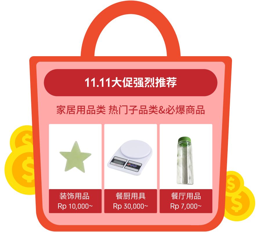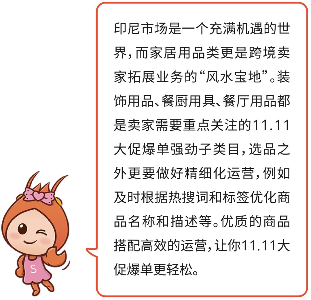 印尼是东南亚地区互联网发展的领头羊,其互联网经济年增长率超过40%。耕耘当下,收获未来,卖家在这一发展过程中要把握住时代机遇,做好店铺产品布局和营销规划,是突破与稳固印尼市场的重要战略。小编带着Shopee吉祥物为卖家准备了丰盛的11.11大促印尼市场“选品盛宴”,快来享用吧!