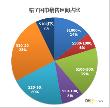 围巾类,20美金以下订单占比34%,多为单piece销售,订单金额在50美金以下占比61%,该类更倾向于单piece或2-5pieces的小额打包销售。
