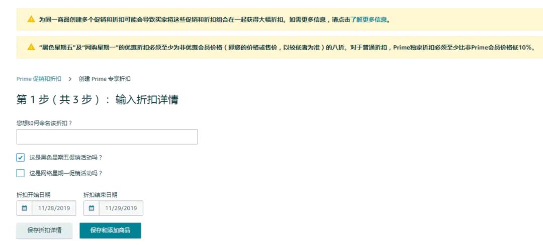 在黑色星期五和网购星期一,商品会在搜索结果和详情页面中向获得认可的 Prime 会员显示黑色星期五和网购星期一促销标记。您可以在 2019 年 11 月 15 日前为黑色星期五和网购星期一创建 Prime 专享折扣。